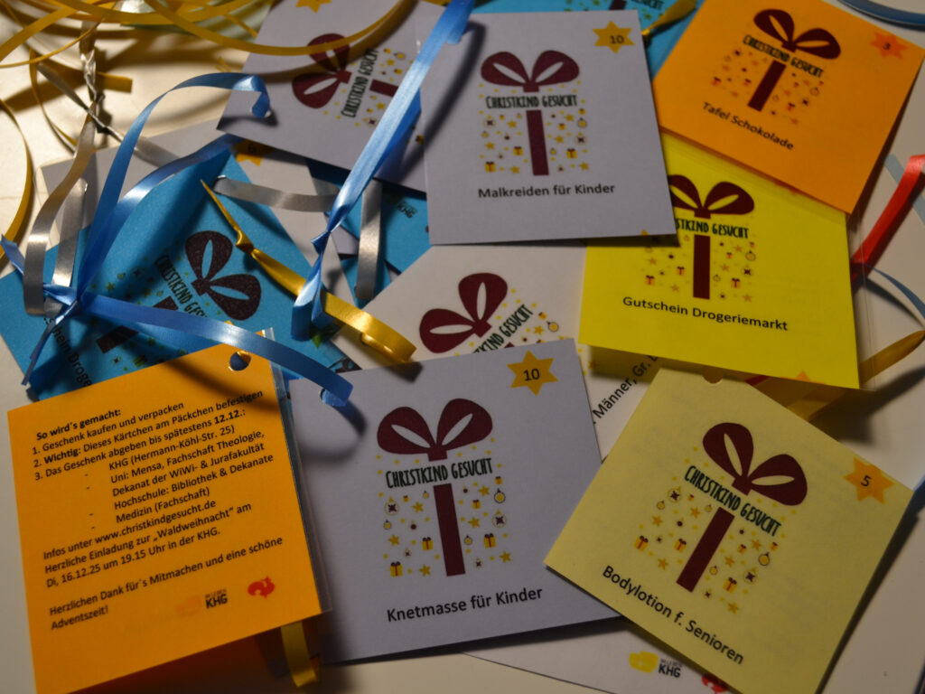 Am 18. Dezember verteilten Engagierte von der Evangelischen und Katholischen Hochschulgemeinde unzählige Geschenke an 12 Sozialeinrichtungen in Augsburg. Zuvor wurden wieder die Bedarfe der Einrichtungen auf Anhänger gedruckt und an Christbäumen an Universität, Technischer Hochschule, Medizinischer Fakultät, Leopold Mozart College, ESG, KHG und Moritzpunkt aufgehängt.